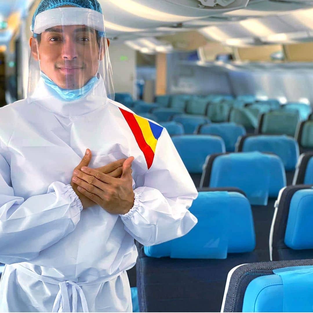 Filipino fashion designer Erwin Tan, known for his made-to-order works, teamed up with flag carrier Philippine Airlines. His finished PPE was made of an all-white fabric with adjusted proportions and cinched waist for added comfort and form. The design also included a clear-cut shoulder accent featuring the colors of the Philippine flag.