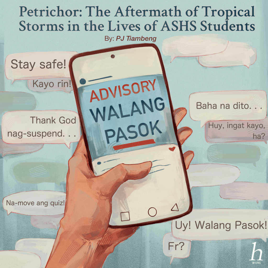 Meanwhile, the ASHS Sandigan Kanlaon, the school’s Disaster Readiness and Risk Reduction (DRRR) committee, sends out advisory posts containing important information about the calamity and how it is moving throughout the Philippines, along with personal steps on how to respond. Fiel Torres, the Sandigan Kanlaon overall head, said, “We take immediate action on this to ensure that the ASHS community is well-aware of what actions to take.” Furthermore, the Sandigan is expected to implement a home-assessment survey called “KanlaHome,” a longstanding project of theirs, to suggest and evaluate how each student can improve their preparedness from their homes. This would also help the school focus its efforts on the aspect that is mostly lacking in each home—may this be knowing evacuation routes, having go-bags, and more.
