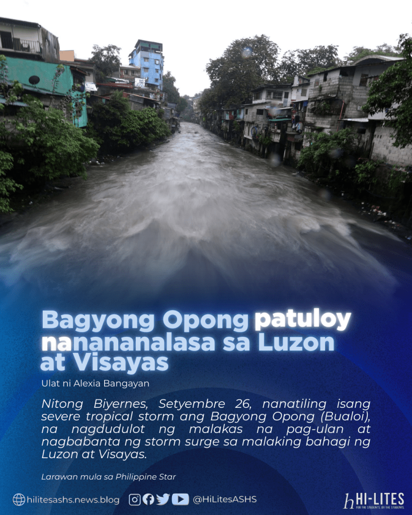 Nitong Biyernes, Setyembre 26, nanatiling isang severe tropical storm ang Bagyong Opong (Bualoi), na nagdudulot ng malakas na pag-ulan at nagbabanta ng storm surge sa malaking bahagi ng Luzon at Visayas.