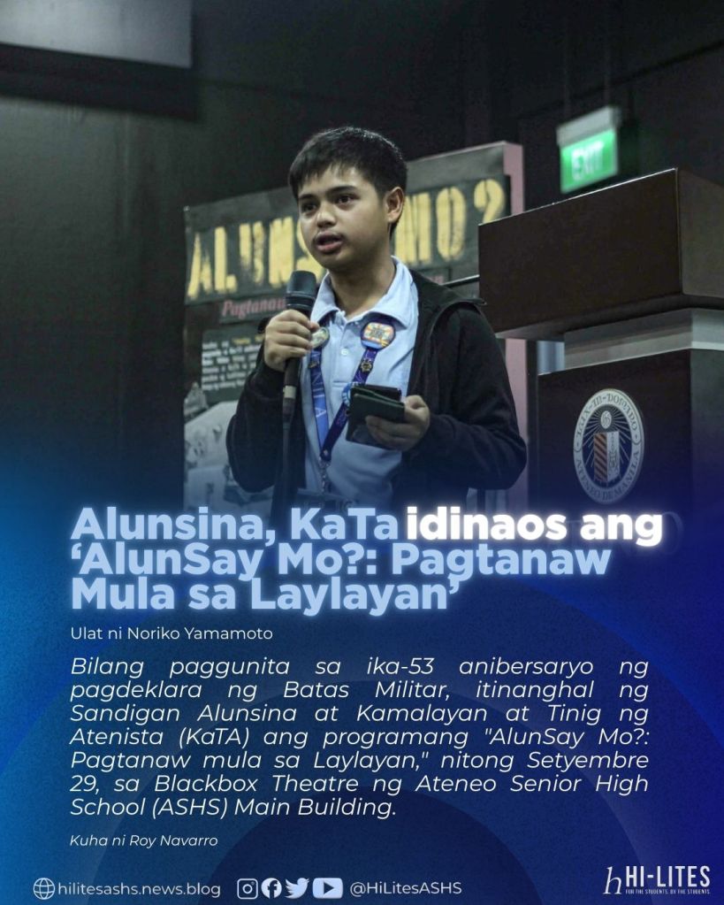 Bilang paggunita sa ika-53 anibersaryo ng pagdeklara ng Batas Militar, itinanghal ng Sandigan Alunsina at Kamalayan at Tinig ng Atenista (KaTA) ang programang “AlunSay Mo?: Pagtanaw mula sa Laylayan,” nitong Setyembre 29, sa Blackbox Theatre ng Ateneo Senior High School (ASHS) Main Building.