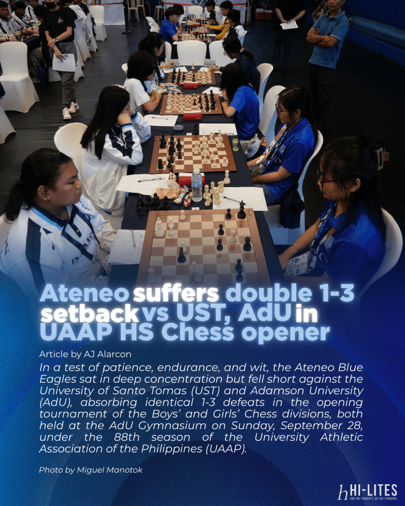 In a test of patience, endurance, and wit, the Ateneo Blue Eagles sat in deep concentration but fell short against the University of Santo Tomas (UST) and Adamson University (AdU), absorbing identical 1-3 defeats in the opening tournament of the Boys’ and Girls’ Chess divisions, both held at the AdU Gymnasium on Sunday, September 28, under the 88th season of the University Athletic Association of the Philippines (UAAP).