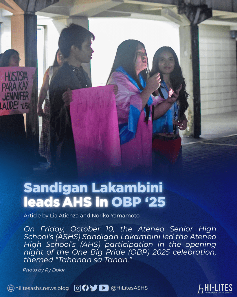 On Friday, October 10, the Ateneo Senior High School’s (ASHS) Sandigan Lakambini led the Ateneo High School’s (AHS) participation in the opening night of the One Big Pride (OBP) 2025 celebration, an annual university-wide pride celebration within the Ateneo de Manila University (ADMU) community, themed “Tahanan sa Tanan.”