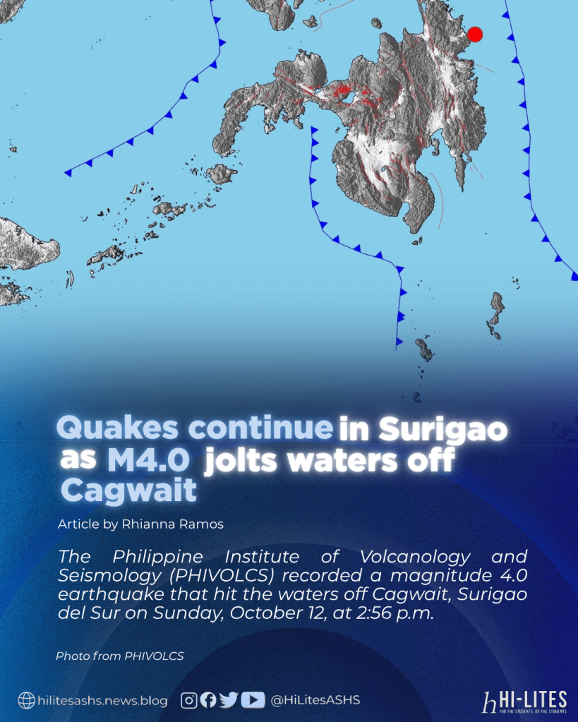 The Philippine Institute of Volcanology and Seismology (PHIVOLCS) recorded a magnitude 4.0 earthquake that hit the waters off Cagwait, Surigao del Sur on Sunday, October 12, at 2:56 p.m.