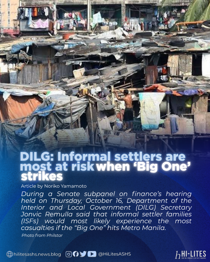 During a Senate subpanel on finance’s hearing held on Thursday, October 16, Department of the Interior and Local Government (DILG) Secretary Jonvic Remulla said that informal settler families (ISFs) would most likely experience the most casualties if the “Big One” hits Metro Manila.