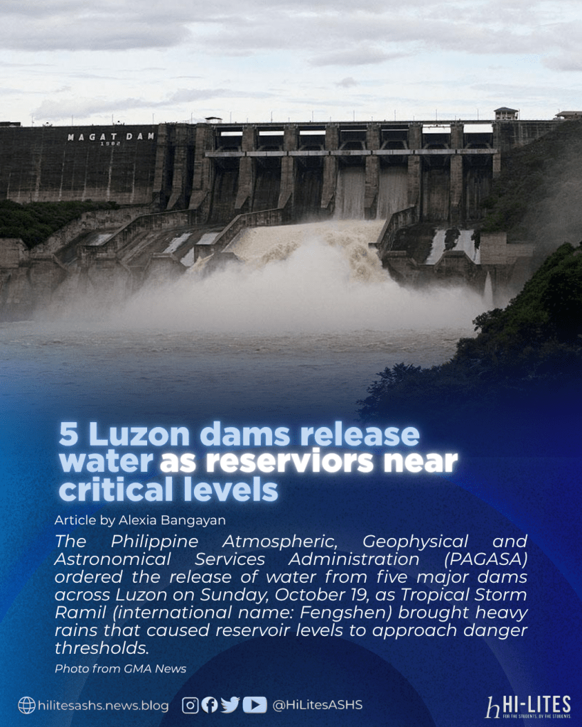 The Philippine Atmospheric, Geophysical and Astronomical Services Administration (PAGASA) ordered the release of water from five major dams across Luzon on Sunday, October 19, as Tropical Storm Ramil (international name: Fengshen) brought heavy rains that caused reservoir levels to approach danger thresholds.
