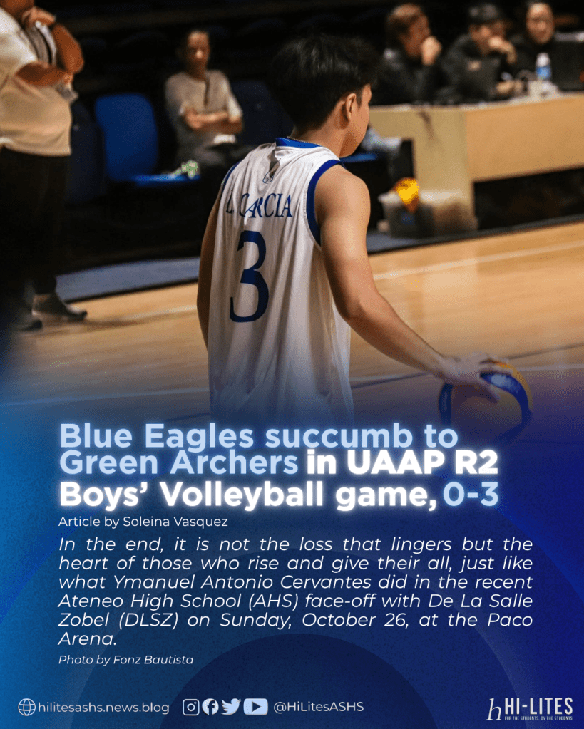 In the end, it is not the loss that lingers but the heart of those who rise and give their all, just like what Ymanuel Antonio Cervantes showed in the recent Ateneo High School (AHS) face-off with De La Salle Zobel (DLSZ) on Sunday, October 26, at the Paco Arena, where Ateneo fell to La Salle in straight sets, 17–25, 21–25, 15–25, in the opening match of the second round of the University Athletic Association of the Philippines (UAAP) Season 88 High School Boys’ Volleyball Tournament.