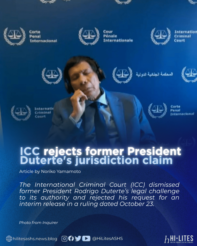The International Criminal Court (ICC) dismissed former President Rodrigo Duterte’s legal challenge to its authority and rejected his request for an interim release in a ruling dated October 23.