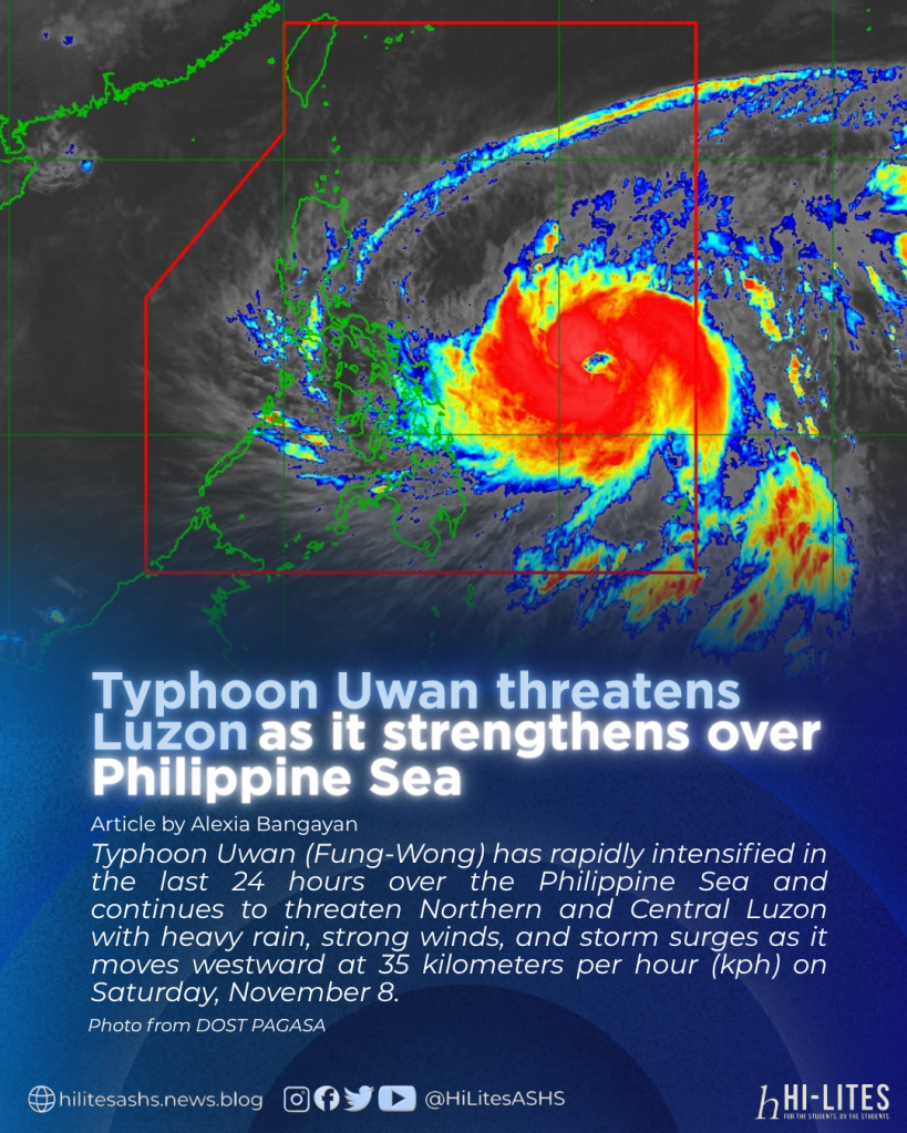 Typhoon Uwan (Fung-Wong) has rapidly intensified in the last 24 hours over the Philippine Sea and continues to threaten Northern and Central Luzon with heavy rain, strong winds, and storm surges as it moves westward at 35 kilometers per hour (kph) on Saturday, November 8.