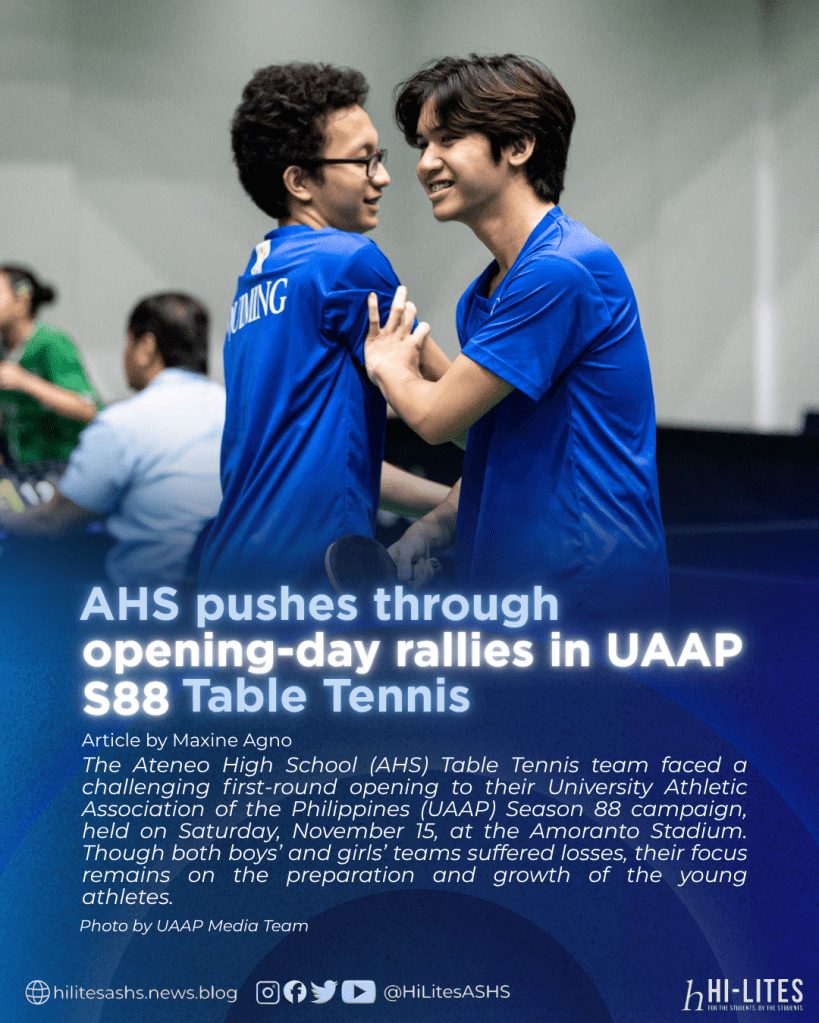 The Ateneo High School (AHS) Table Tennis team faced a challenging first-round opening to their University Athletic Association of the Philippines (UAAP) Season 88 campaign, held on Saturday, November 15, at the Amoranto Stadium. Though both boys’ and girls’ teams suffered losses, their focus remains on the preparation and growth of the young athletes.