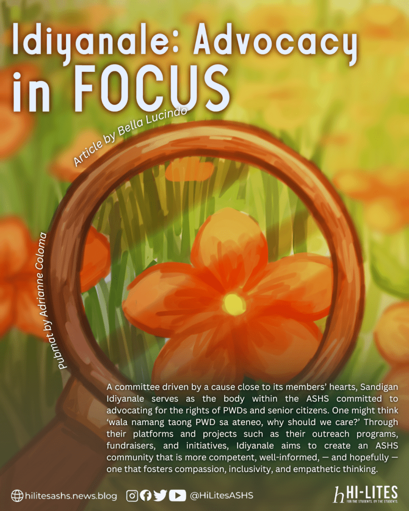 “It’s usually taboo for most of us — you know — questions like, ‘How do I approach this person without being ableist?’ or ‘Is there a way for me to accommodate people who experience life differently from me?’ We want to create a more competent student body by informing them of timely — and, as of now, very persistent — issues in our society, a society that remains prejudiced toward PWDs and senior citizens. Essentially, we hope to build a community that is more prepared for and open to conversations about our advocacies,” said Kyle Ignacio, Sandigan Idiyanale’s Overall Head. Idiyanale gives their all to fighting for a more inclusive society, and they can only pray that the ASHS, and the world beyond, open their hearts and minds to these causes.