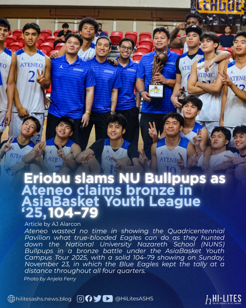 Ateneo wasted no time in showing the Quadricentennial Pavilion what true-blooded Eagles can do as they hunted down the National University Nazareth School (NUNS) Bullpups in a bronze battle under the AsiaBasket Youth Campus Tour 2025, with a solid 104–79 showing on Sunday, November 23, in which the Blue Eagles kept the tally at a distance throughout all four quarters.