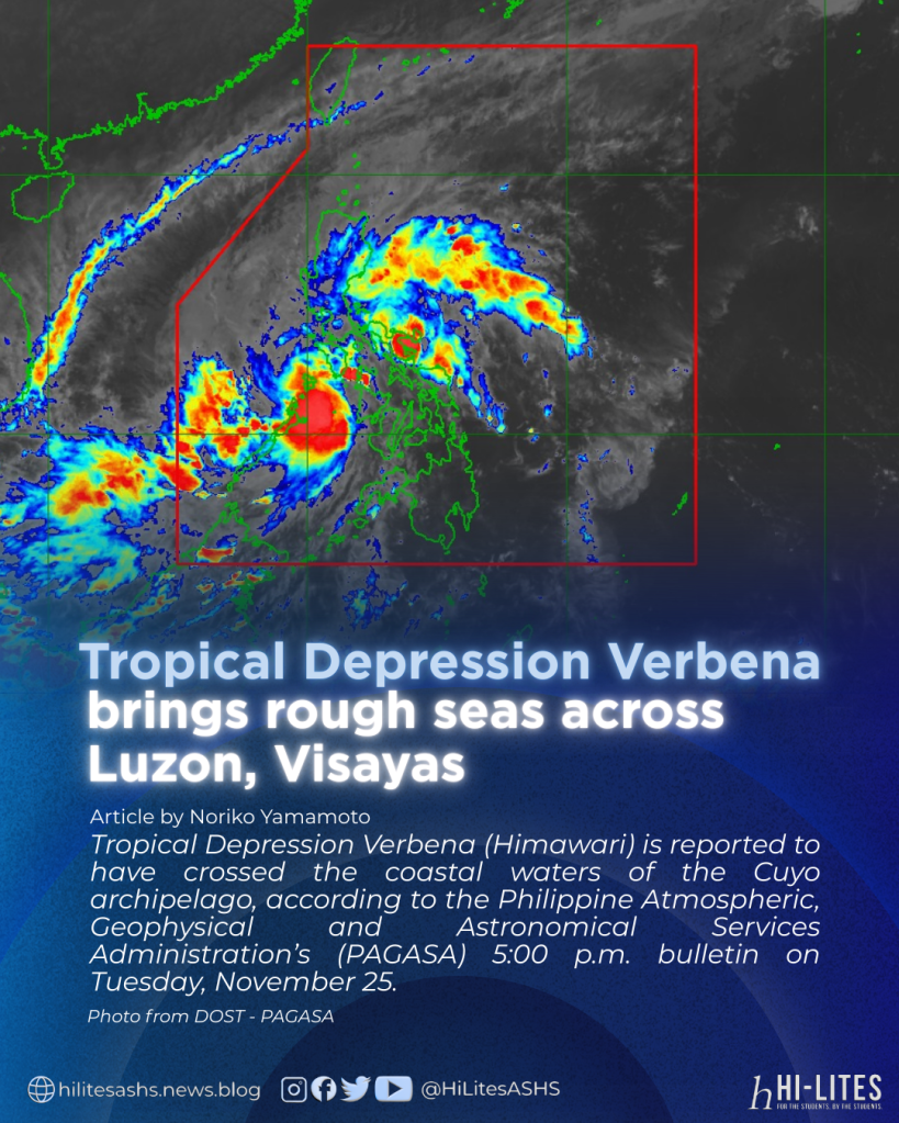 Tropical Depression Verbena (Himawari) is reported to have crossed the coastal waters of the Cuyo archipelago, according to the Philippine Atmospheric, Geophysical and Astronomical Services Administration’s (PAGASA) 5:00 p.m. bulletin on Tuesday, November 25.
