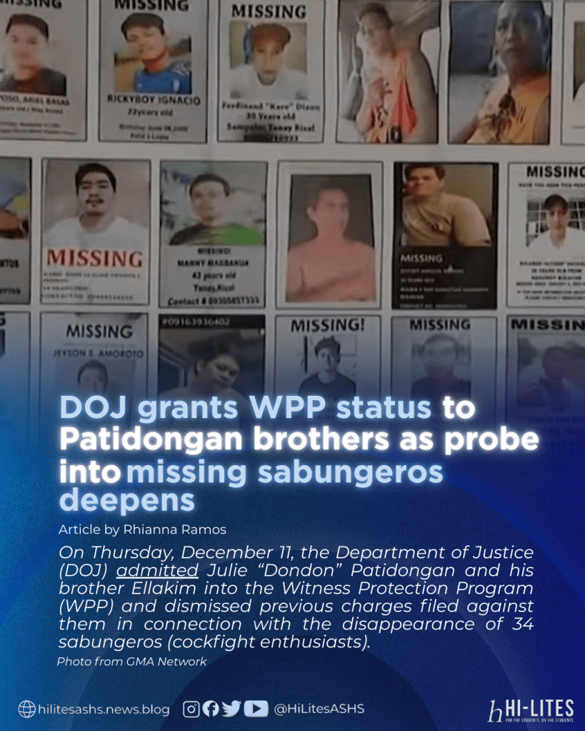 On Thursday, December 11, the Department of Justice (DOJ) admitted Julie “Dondon” Patidongan and his brother Ellakim into the Witness Protection Program (WPP) and dismissed previous charges filed against them in connection with the disappearance of 34 sabungeros (cockfight enthusiasts).