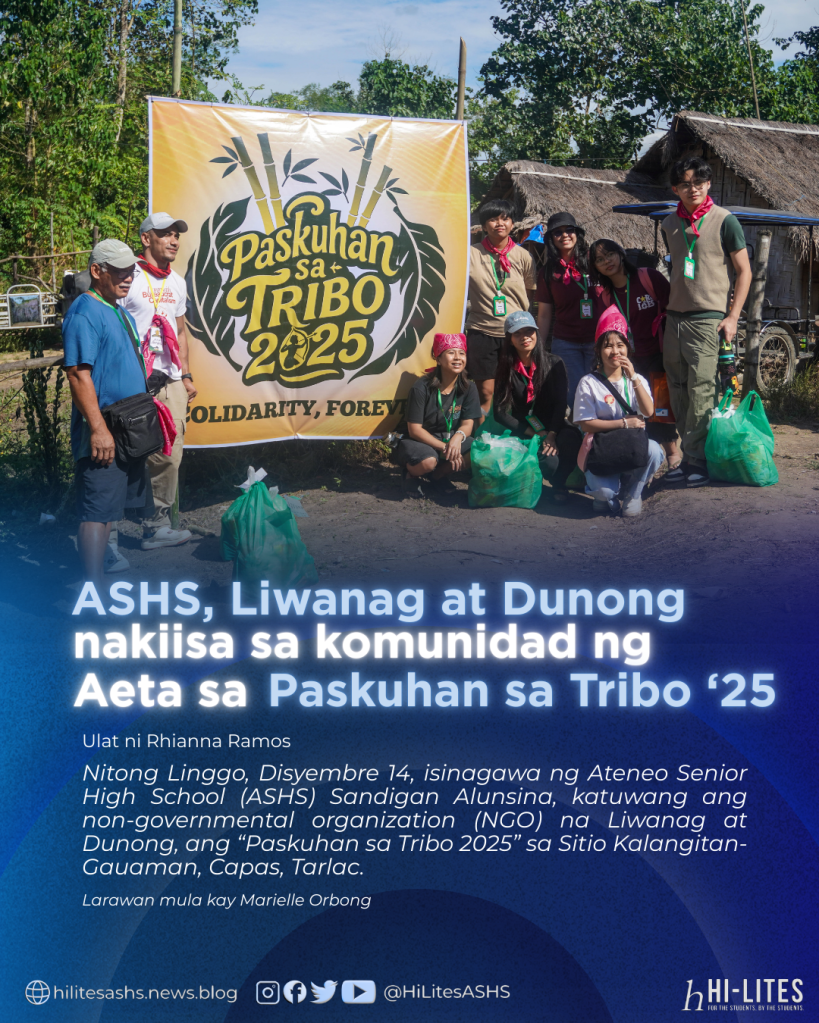 Nitong Linggo, Disyembre 14, isinagawa ng Ateneo Senior High School (ASHS) Sandigan Alunsina, katuwang ang non-governmental organization (NGO) na Liwanag at Dunong, ang “Paskuhan sa Tribo 2025” sa Sitio Kalangitan-Gauaman, Capas, Tarlac.