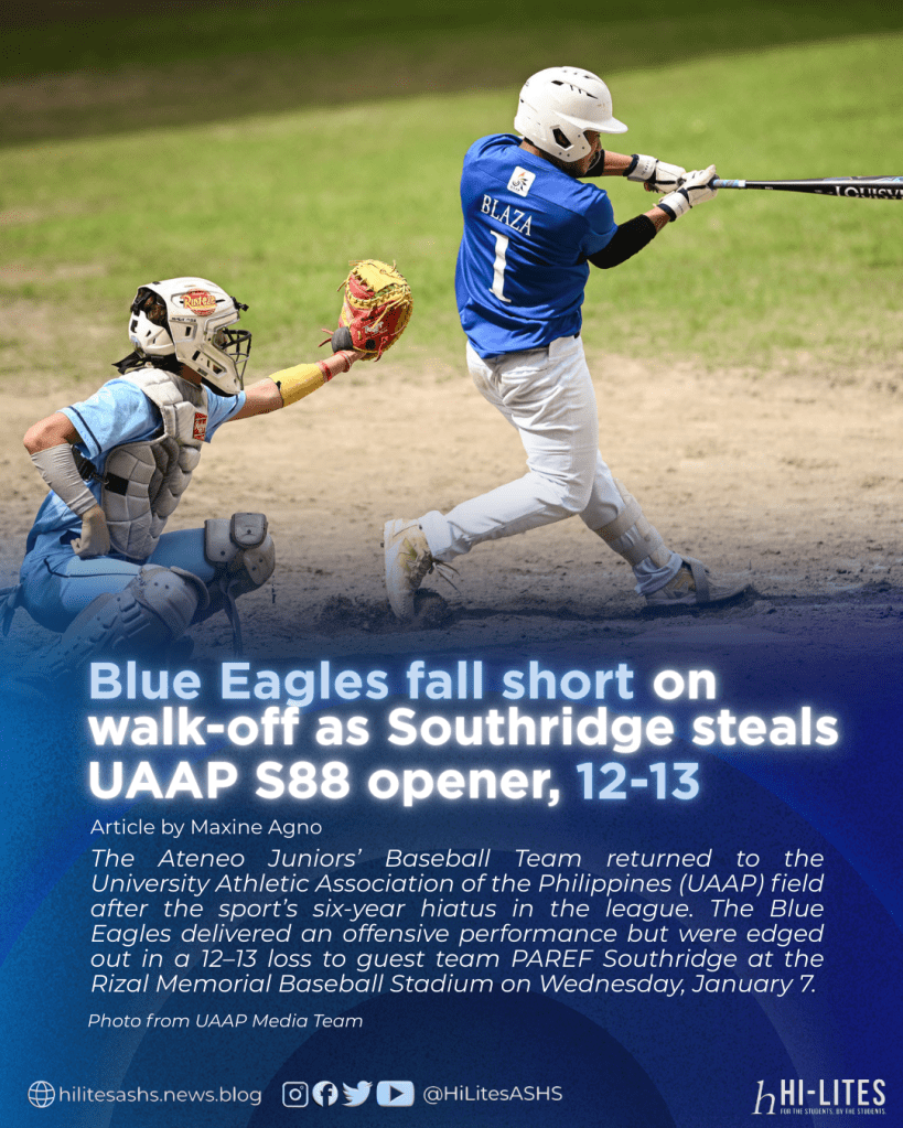 The Ateneo Juniors’ Baseball Team returned to the University Athletic Association of the Philippines (UAAP) field after the sport’s six-year hiatus in the league. The Blue Eagles delivered an offensive performance but were edged out in a 12–13 loss to guest team PAREF Southridge at the Rizal Memorial Baseball Stadium on Wednesday, January 7.