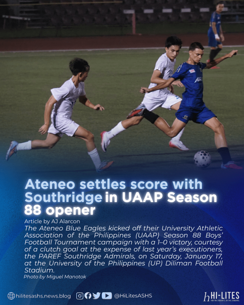 The Ateneo Blue Eagles kicked off their University Athletic Association of the Philippines (UAAP) Season 88 Boys’ Football Tournament campaign with a 1–0 victory, courtesy of a clutch goal at the expense of last year’s executioners, the PAREF Southridge Admirals, on Saturday, January 17, at the University of the Philippines (UP) Diliman Football Stadium.