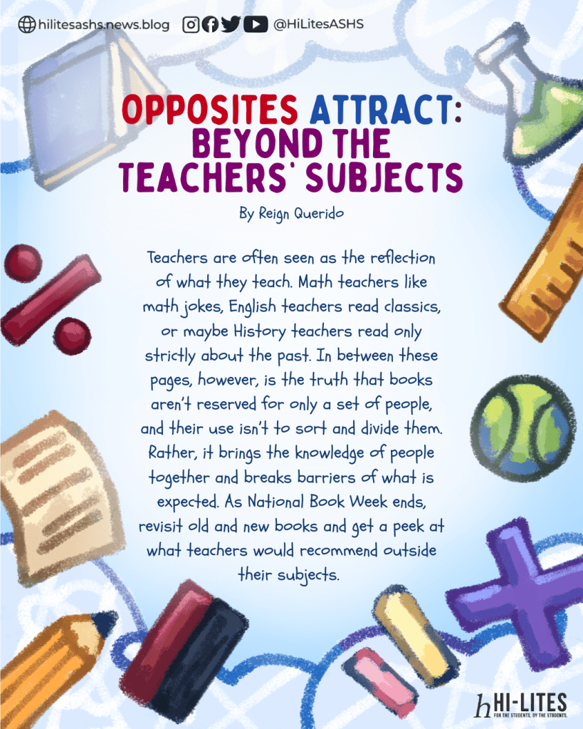 A walking encyclopedia — full of wisdom, knowledge, and surprises — teachers serve as the picture-perfect image of someone who doesn’t use a textbook to be restricted, but rather, a guide to open doors to opportunities. Books are very diverse, and it chooses you. With vast genres, it breaks barriers to the typical opinions of ‘read this because you’re—!’ You’re a HumSS student, read sci-fi! You don’t like dating in real life, read romance! Books do not revolve around assumptions and stereotypes because learning is not boxed to subjects. In the books suggested by teachers, we see just how they go beyond their subject departments and see the opposites attract in the world of books.