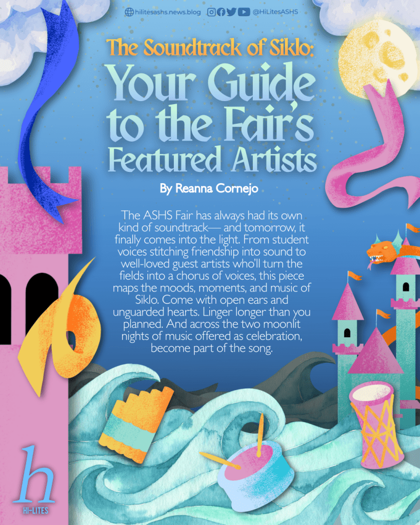 A Fair is often defined by color and feeling: warm lights in the dusk, the blur of booths, sugar-dust in the air, familiar faces half-lost in motion — but the ASHS Fair has always had its sound. Footsteps sync with basslines. Laughter drifts like backing vocals. When the Ateneo Senior High School Fair turns on its lights on January 30, the featured artists become more than just performers on a stage. They symbolize a map of moods, constellations of student stories, and a promise that somewhere between the first chord and the last encore, you will recognize yourself.